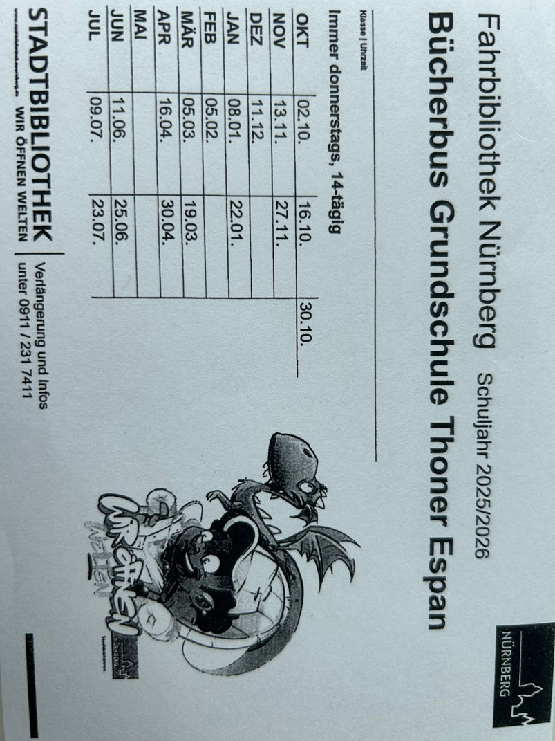 Der Bücherbus kommt an den folgenden Terminen während der Unterrichtszeit an die Grundschule Thoner Espan:
